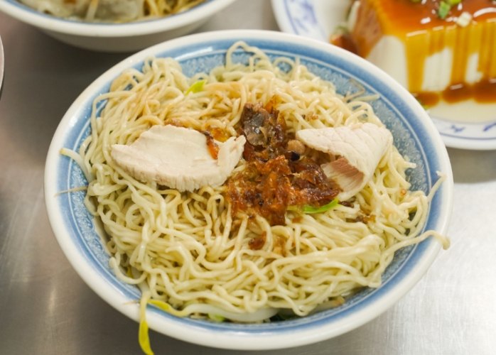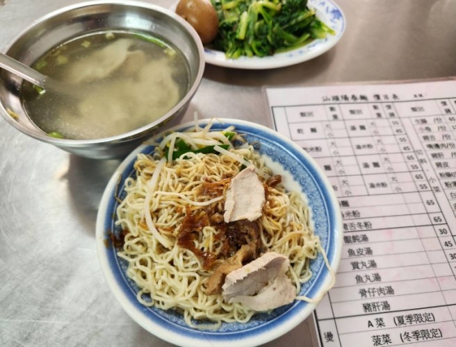 A2: 這... 嗯,傳統道地的 汕頭陽春麵 就是吃它湯頭和豬油蔥酥的純粹風味,通常不加肉燥(加了反而搶味、弄濁湯頭)。滷味(豆乾、海帶、滷蛋等)是另外單點的小菜,不會直接加進麵碗裡。加肉燥的通常是南部常見的陽春麵作法,和汕頭風味是不同的路線。想吃肉?點盤切豬頭肉或嘴邊肉配著吃更對味!