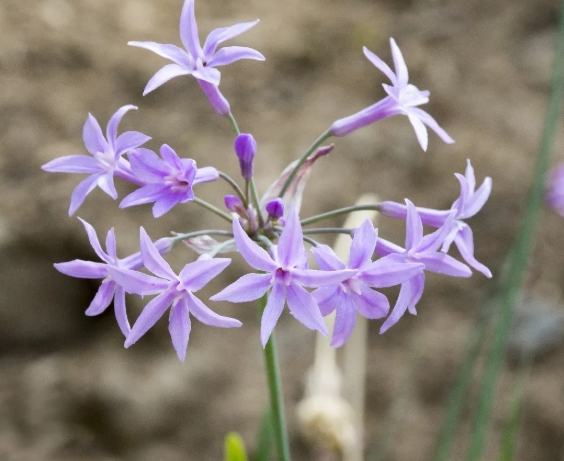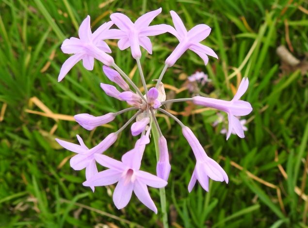 大家最常見到、種植的,就是普通紫嬌花 (Tulbaghia violacea)。它的花是那種標準的淡紫羅蘭色,成簇開放,香味嘛... 有人說香,但我個人覺得有點像蒜頭混了點花香的味道(後來才知道它的確有個外號叫「社會蒜」!)。葉子細長,質感像草,叢生狀。